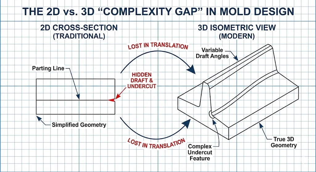 - Geometrisk inkompatibilitet: 2D-design mangler ofte data for variable trekkvinkler, som er avgjørende for ren utstøting av komplekse plastdeler.