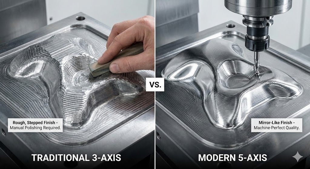 - Manuell benking: Dårlig overflatebehandling fra 3-akse maskiner krevde ofte timer med manuell polering (også kjent som benching) for å oppnå den nødvendige jevnheten.