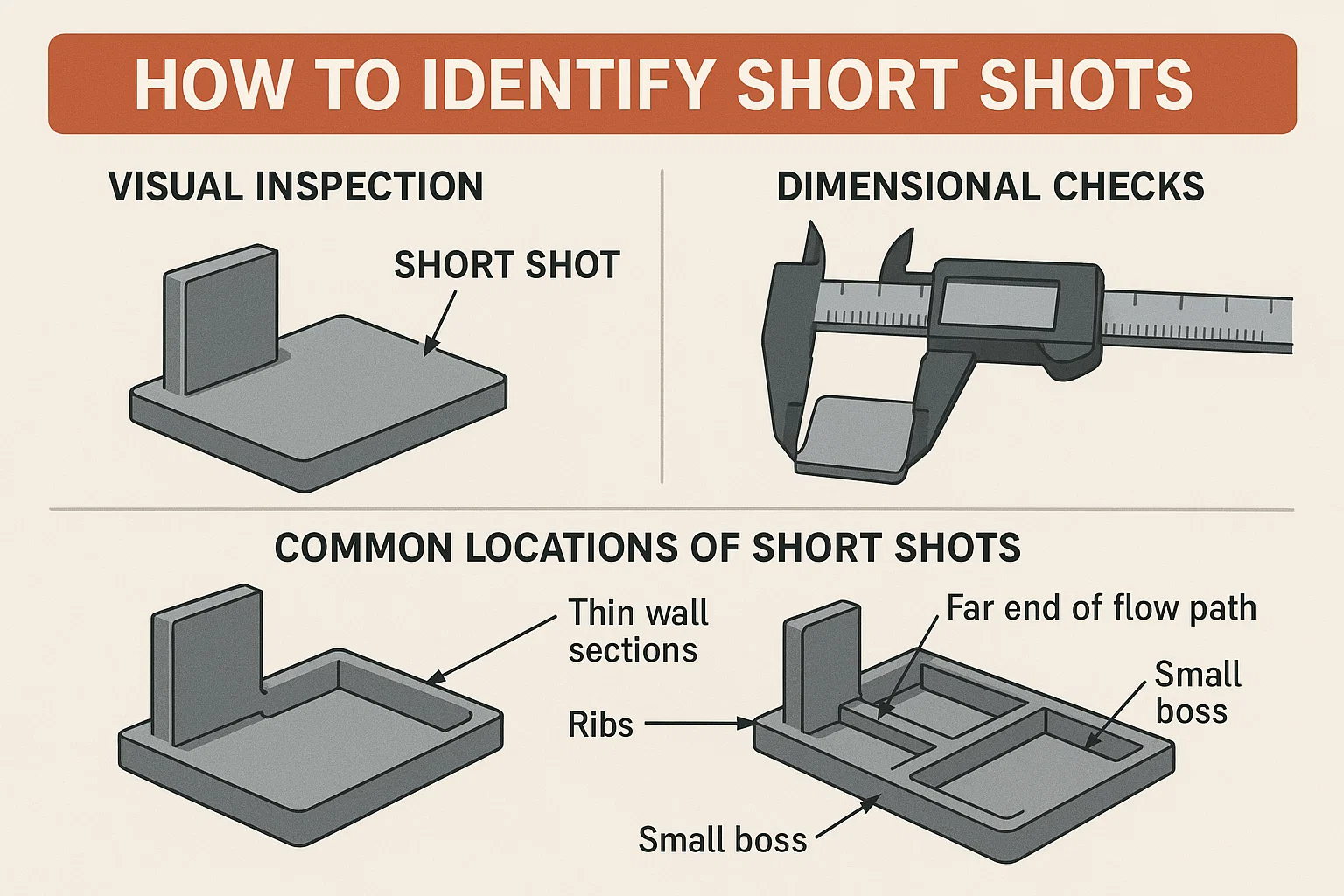 Den vanligste måten å oppdage et kort skudd er gjennom en rask visuell sjekk. Et kort skudd er umiddelbart åpenbart fordi delen er ufullstendig. Du vil merke at deler av delen mangler eller at delen ender brått med en avrundet, uferdig kant der plaststrømmen stoppet. Dette er typisk en jevn, buet overflate fordi den smeltede plastens overflatespenning får den til å trekke litt tilbake slik den stivner. Dette er et kjent tegn på at formhulen ikke var fylt.
