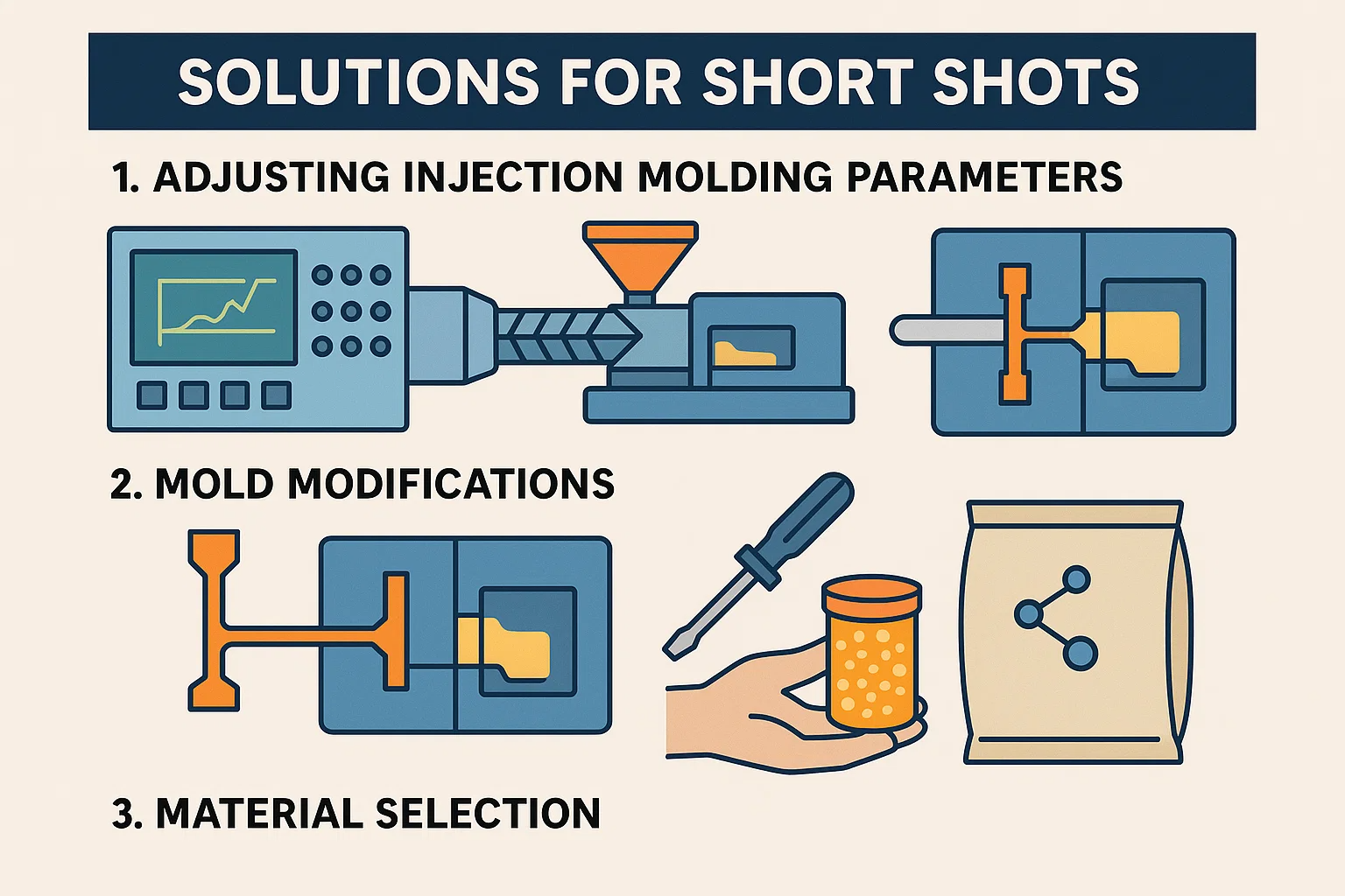 Å løse et kort skudd krever en strategisk tilnærming. Det er ofte best å starte med de enkleste og mest kostnadseffektive løsningene før du flytter til mer komplekse og dyre. Begynn med maskininnstillinger, bør du vurdere materiale, og se til slutt på selve formen.