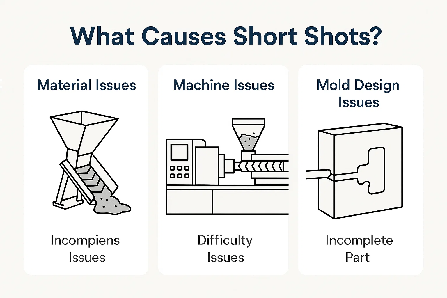 Ventilasjonsproblemer: Når plast fyller en form, må luften fanget inni ha en måte å rømme på. Hvis muggens ventilasjonsåpninger er blokkert eller feil størrelse, vil den fangede luften skape et baktrykk som motstår strømmen av plast, og effektivt "kortslutning" skuddet.